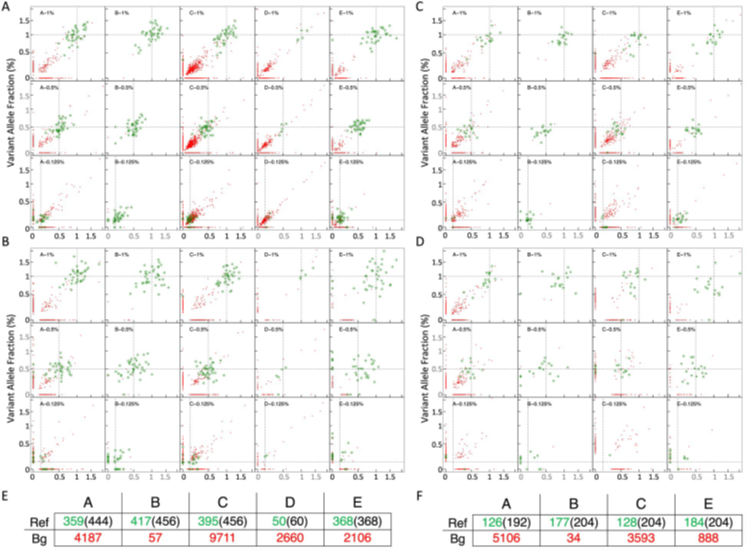 测评中针对液态活检临床应用中最重要的两个指标——灵敏度和特异性(低假阳性率),通过不同的检测起始量和检测突变频率(VAF)比较了各家产品的性能。当采用各产品推荐的检测起始量(30ng或50ng cfDNA)时,5款产品针对大于等于0.5%VAF基因突变的检测均展现了非常好的灵敏度和良好的特异性,整体表现显著高于以往的平行比较测评,如SEQC2研究。