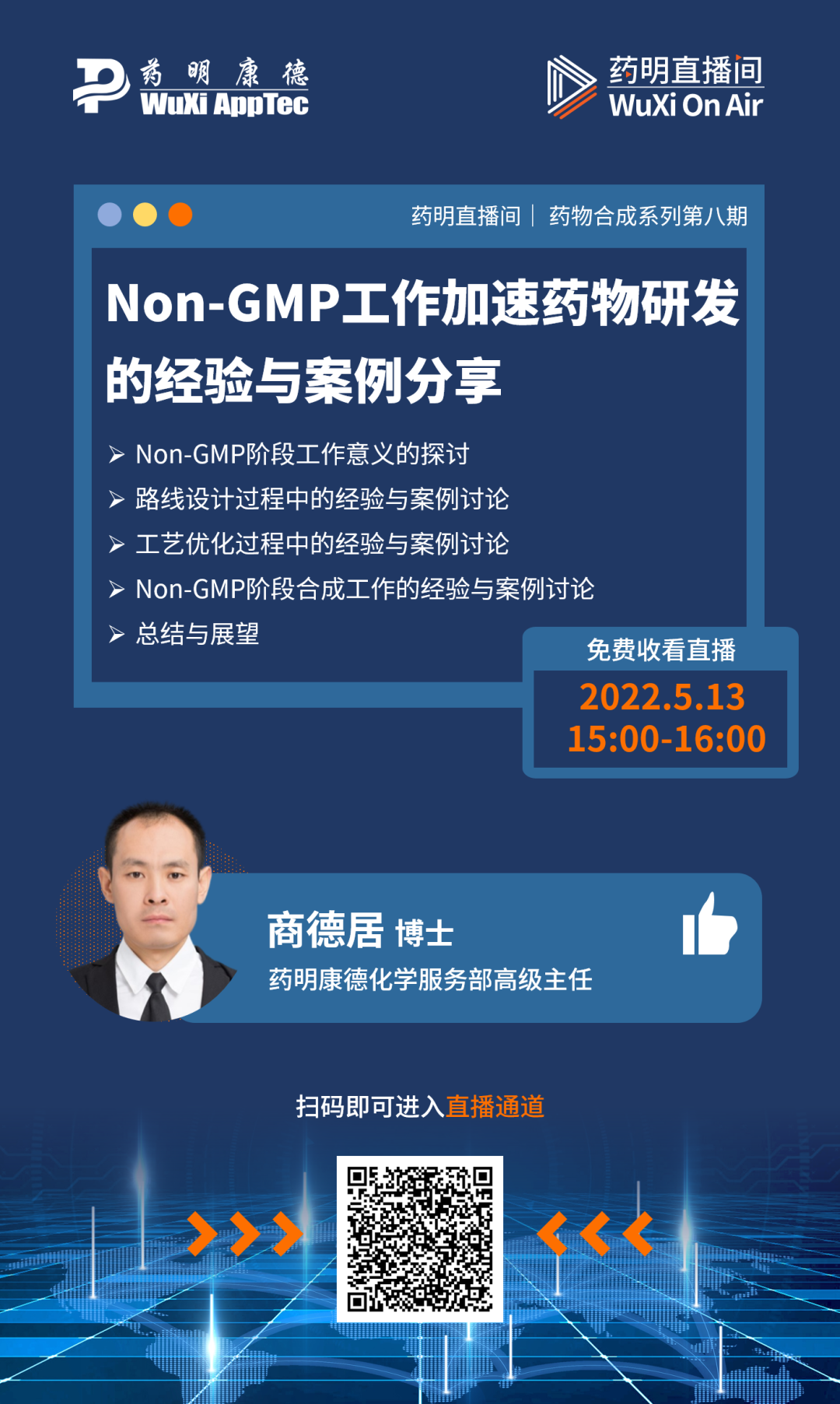 主题:Non-GMP工作加速药物研发的经验与案例分享 主讲人:商德居 博士 药明康德化学服务部高级主任 时间:2022年5月13日,15:00 – 16:00 |