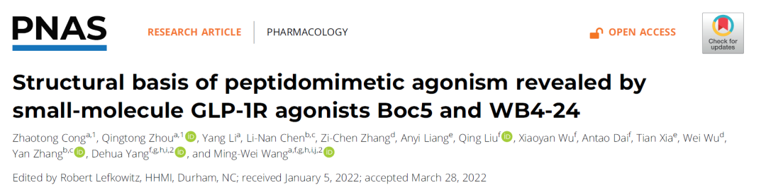 2022年5月14日(北京时间),复旦大学基础医学院王明伟团队携手中国科学院上海药物研究所杨德华团队在《美国国家科学院院刊》(Proceedings of the National Academy of Sciences of the United States of America)在线发表了题为“Structural basis of peptidomimetic agonism revealed by small-molecule GLP-1R agonists Boc5 and WB4-24”的研究成果(图1)。这篇由2012年诺贝尔化学奖得主Robert J. Lefkowitz教授主审的直投(PNAS Direct Submission)论文报道了全球首个具有体内疗效的胰高血糖素样肽-1受体(Glucagon-like peptide-1 receptor, GLP-1R)非肽类激动剂Boc5及其衍生物WB4-24发挥拟肽效应的结构基础和分子机制,对基于该靶点的药物研发具有重要的指导意义。