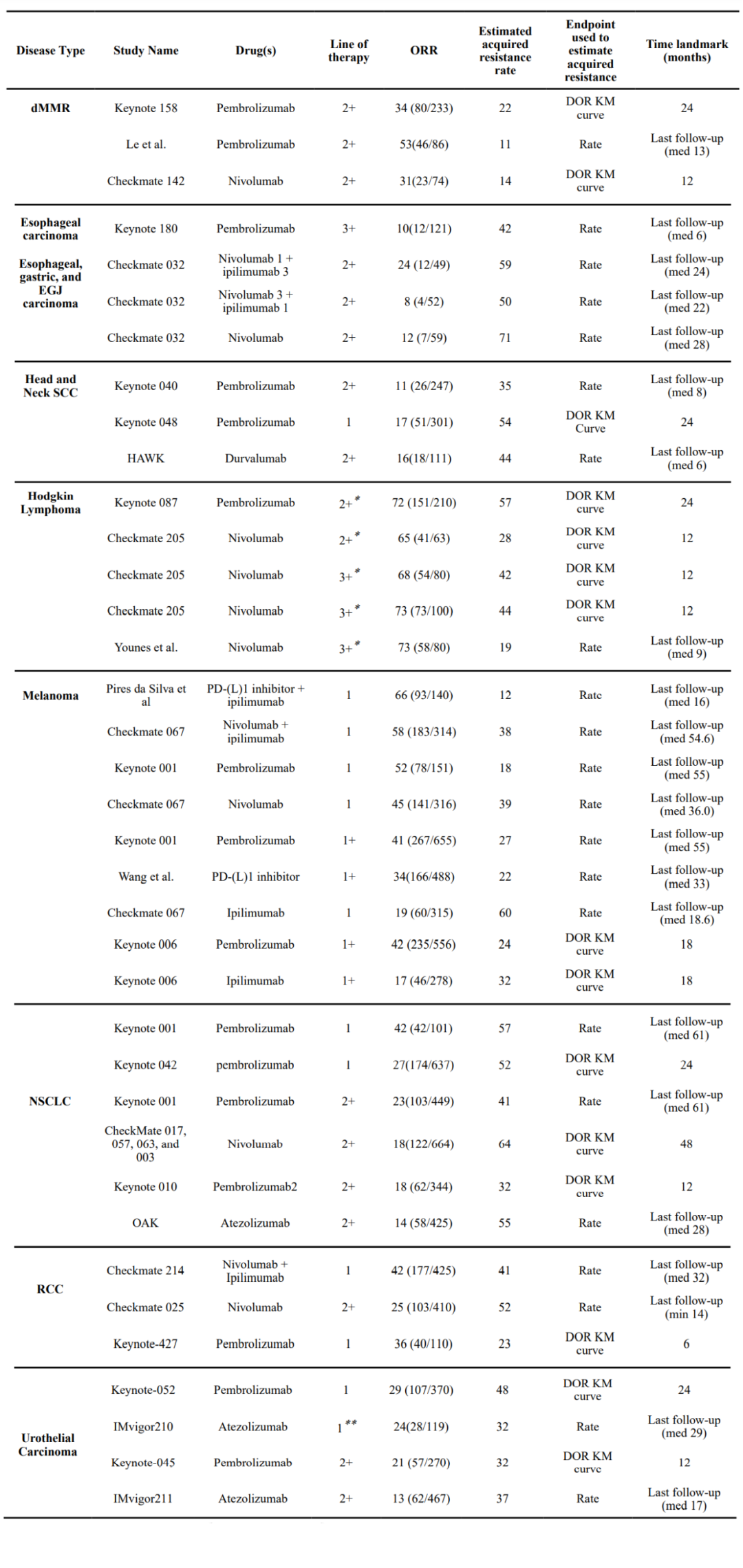 更普遍地说,在不同的肿瘤类型中,PD-1抑制剂的总应答率与应答者获得性耐药的频率之间似乎呈反比关系。