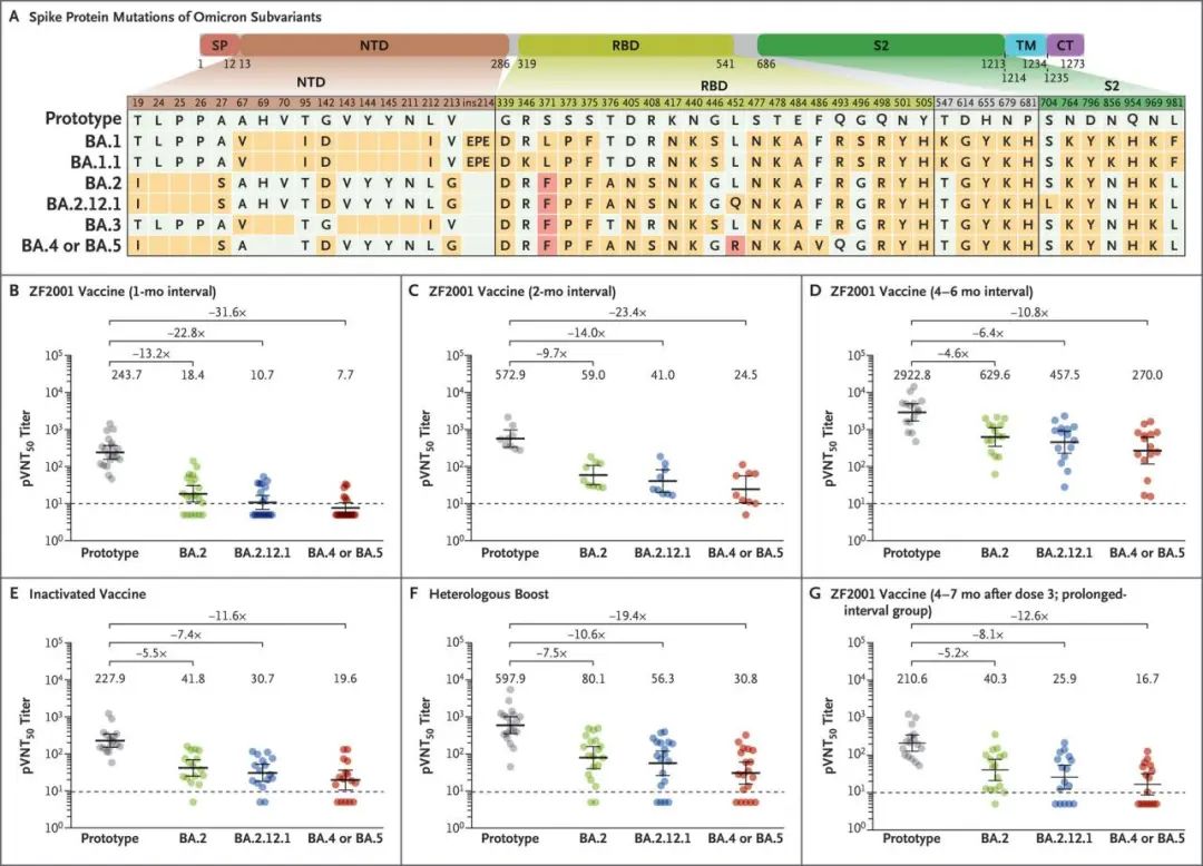 在新冠肺炎(COVID-19)大流行的第三年,新型冠状病毒(SARS-CoV-2)的omicron变体席卷全球并产生了其他几个亚变种。目前,BA.2在全球流行的频率已经超过了BA.1。此外,BA.2.12.1变异株的感染也正在迅速增加,并已经占美国新感染病例的50%以上。因此,现有疫苗的保护效果和制定未来疫苗接种战略的必要性便显得极为重要。2022年7月6日,新英格兰杂志(NEJM)在线发表了中国科学院微生物研究所高福院士团队通讯文章:Omicron SARS-CoV-2 Neutralization from Inactivated and ZF2001 Vaccines。系统评估了目前国内接种的新冠疫苗以及接种加强针后对新冠病毒及其奥密克戎变异株的中和效果。在这项研究中,研究人员使用假病毒中和来评估接种疫苗志愿者的血清样品中针对SARS-CoV-2原始株及其各种变体BA.1,BA.1.1,BA.2,BA.2.12.1,BA.3,BA.4和BA.5的中和抗体滴度。疫苗接种者接受了三剂灭活病毒疫苗(CoronaVac和BBIBP-CorV)中的一种,三剂蛋白质亚单位疫苗ZF2001(使用二聚体RBD作为抗原),或接种两剂CoronaVac灭活疫苗后加强ZF2001。在每个疫苗组中,针对所有测试的变异株的中和抗体滴度显著低于针对原始株的相应滴度,结果表明,变异株具有实质性的免疫逃逸。中和滴度的降低与刺突蛋白的突变有关。BA.1.1和BA.2的中和程度与BA.1相似(在1.5倍以内)。BA.2.12.1与BA.2相比,其RBD中具有额外的L452Q突变,因此中和滴度较低,为1.4-1.7倍。在每个接种疫苗的组中,针对BA.4和BA.5的中和抗体滴度比BA.2变异株低2.1-2.6倍,BA.4和BA.5是目前在南非占主导地位并有可能成为全球下一个大流行变异株。这一发现表明,与BA.2亚变种中的RBD相比,RBD中的两个突变(L452R和F486V)导致基于原始株序列设计的当前疫苗引发的抗体中和效率较低。为了确定更好的ZF2001疫苗接种策略,研究人员在第三剂疫苗后1个月从志愿者中收集了样本。根据第二剂和第三剂之间的间隔将此组细分为三个亚组:1个月、2个月和4-6个月。此外,为了测试ZF2001疫苗接种后长间隔亚组中的中和抗体持久性,研究在第三剂后4-7个月获得了血清样本。研究发现,中和抗体滴度随着第二剂和第三剂之间间隔的增加而增加,特别是针对奥密克戎变异株。在第二剂和第三剂之间间隔为4-6个月的疫苗志愿者中,与剂量间隔为1个月的疫苗组相比,中和抗体滴度比原始株高出近10倍,对所有变体高出约30倍。长间隔组中的疫苗对所有测试的奥密克戎呈100%血清阳性。在长间隔亚组最后一剂疫苗6个月后获得的样品中,针对所有奥密克戎变种的中和抗体滴度和血清反应阳性率高于短间隔亚组最后一剂1个月后获得的样品。异源增强组对原始株和所有组的中和抗体滴度高于接受三剂相同灭活疫苗的组。然而,与对原始株的反应相比,异源增强组对BA.2,BA.2.12.1,BA.4和BA.5的反应降低大于灭活疫苗组。这一发现表明,这些亚变种在RBD中具有更多的突变,从而导致免疫逃逸。新变种的迅速出现使得特定变种疫苗的开发变得困难。研究结果表明,对当前疫苗采取更好的免疫策略可能有助于提高奥密克戎变种的中和水平。由于ZF2001疫苗由一个蛋白质亚基组成,其抗原聚焦于RBD,因此其使用可以通过施用多个加强剂量和免疫成熟方法诱导针对亚微米亚变体的中和抗体滴度增加。然而,需要开发更新的疫苗作为加强剂,以更好地防止当前亚变种(特别是BA.4和BA.5)和未来可能的流行亚变种的免疫逃逸。文章链接:DOI: 10.1056/NEJMc2206900