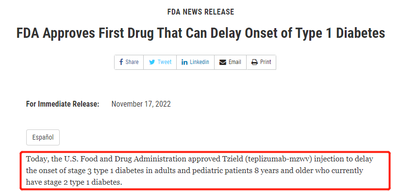 再来回顾一下Tzield获批的适应症:delay the onset of stage 3 type 1 diabetes in adults and pediatric patients 8 years and older who currently have stage 2 type 1 diabetes.
