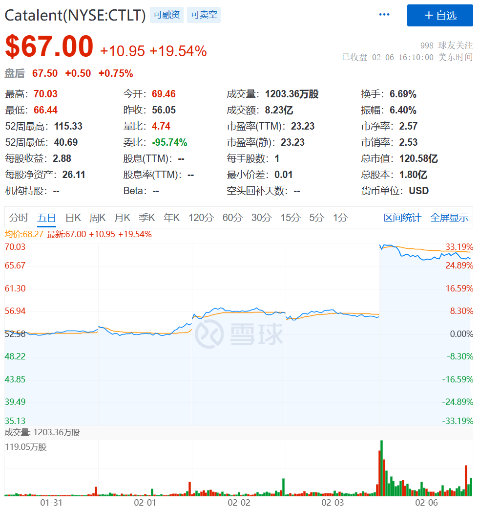资本市场“嗅觉”灵敏,周一收盘,Catalent股价大涨近20%(Catalent有史以来最大的单日涨幅),市值飙升至120亿美元。