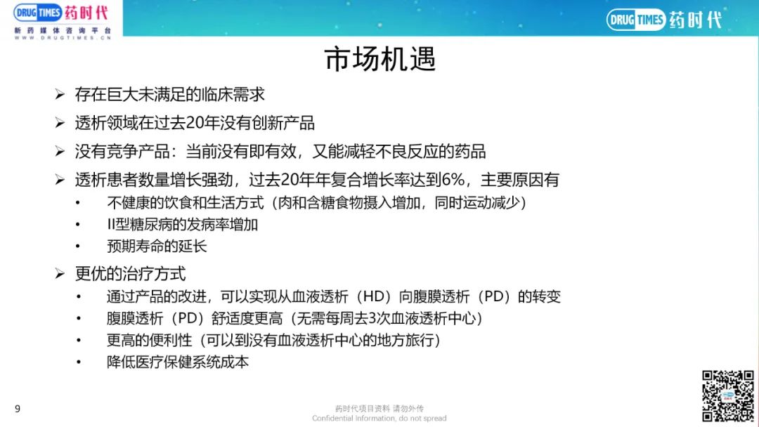 现有企业针对肾病透析设计开发了一种糖基透析液,通过添加二肽丙氨酰-谷氨酰胺,激活或上调腹膜细胞的保护机制,有望显著减少腹膜炎和膜衰竭等严重的副作用。并且使用该技术发生故障的可能性比使用常规透析液时要小。该产品现已进入临床试验Ⅱ期,计划在欧盟和美国开展临床III期研究,有望被美国授予孤儿药资格。