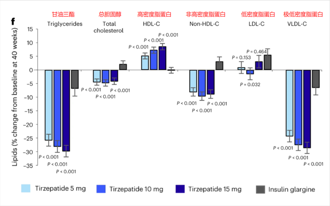 血脂方面,治疗40周时,Tirzepatide 15mg组患者甘油三酯降低最高达29.8%;总胆固醇降低4.77%;非高密度脂蛋白胆固醇降低9.63%;极低密度脂蛋白胆固醇降低28.6%;同时升高高密度脂蛋白胆固醇8.51%。