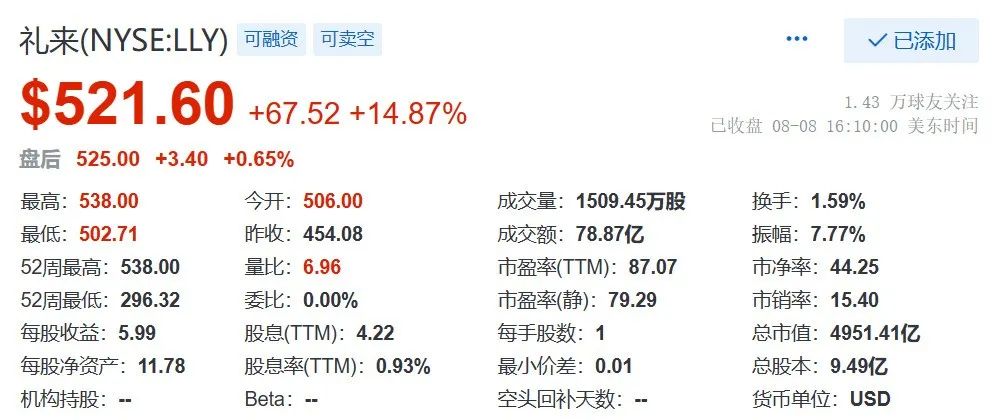 礼来盘中更是达到5100亿美元的巅峰市值,可惜盘后差了一点,市值来到了4951亿美元,离5000大关仅一线之隔。