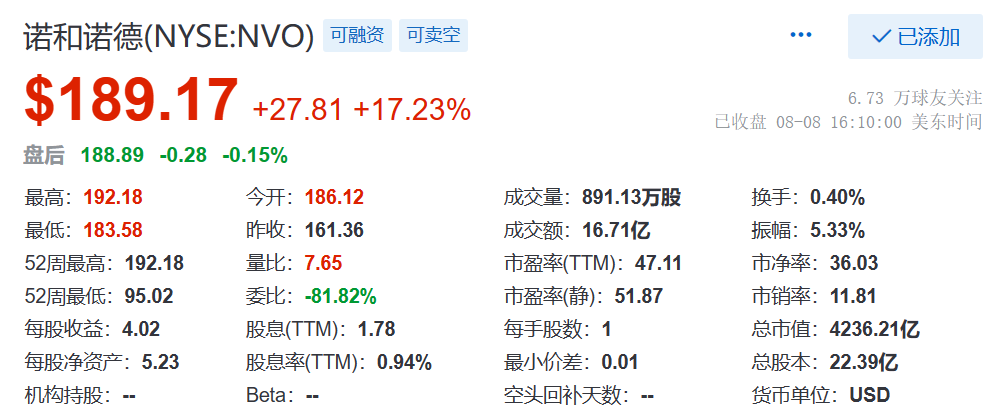 此外,诺和诺德的市值也来到了4236亿美元,距离强生的4500亿美元相隔甚近。