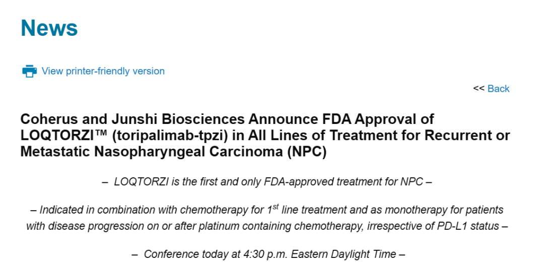 君实PD-1特瑞普利单抗获FDA批准上市! 2023年10月30日 14:53 • 原创作品 浏览量 1148 2023年10月27日,君实与Coherus联合宣布特瑞普利单抗(中文商品名:拓益)获FDA批准,用于(1)特瑞普利单抗联合吉西他滨/顺铂作为晚期复发或转移性鼻咽癌(R/M NPC)患者的一线治疗;(2)单药用于复发或转移性鼻咽癌含铂治疗后的二线及以上治疗,成为我国首款获FDA批准的PD-1! 同时,特瑞普利单抗也是我国首款获批上市的PD-1,于2018年获NMPA批准上市(适应症为黑色素瘤),鼻咽癌的适应症于2020年获NMPA批准上市。 今年6月初,Coherus就已宣布FDA已经顺利完成特瑞普利单抗中国生产基地的上市前检查,提出了三项观察意见。Coherus认为FDA提出的观察意见易解决,预计特瑞普利单抗有望在今年晚些时间取得FDA批准上市,如今特瑞普利单抗的获批如期而至。 此前(2021年2月),君实就与Coherus达成合作,授予北美和加拿大权益。 鼻咽癌在美国属于罕见病,在我国却存在巨大未被满足的临床需求。特瑞普利单抗早于2020年首次纳入医保,目前已有3项适应症纳入《2022年药品目录》,是国家医保目录中唯一用于治疗黑色素瘤的抗PD-1单抗药物。 目前,特瑞普利单抗已在国内批准6项适应症,在2023年的ESMO大会上,拓益在肾癌、淋巴癌、肺癌等众多癌种中表现亮眼。据不完全统计,拓益已在全球开展了覆盖超过15个适应症的40多项临床研究。 相信未来会有更多国产PD-1成功出海FDA。 本篇文章来源于微信公众号: 药时代 发布者:haitao.zhao,转载请首先联系contact@drugtimes.cn获得授权 打赏 为好文打赏 支持药时代 共创新未来! 0 生成海报 仑卡奈单抗单抗皮下注射更有效! 上一篇 2023年10月30日 14:53 阿尔兹海默病疫苗的出现,将怎样影响未来的研发格局? 下一篇 2023年10月30日 14:53 相关推荐 原创作品 显著延缓认知能力下降达到45%!这家公司的阿尔兹海默病新药可称「疗效最佳」? 2023年9月15日 原创作品 这家Biotech融资2亿美元!曾与恒瑞达成合作… 2025年9月4日 原创作品 1个微创新拿到1.3亿美元融资,谁能解决这个临床需求,就能霸占24亿美元的市场…… 2023年3月14日 原创作品 患者死亡!通用型CAR-T先驱遇挫 2025年8月4日 原创作品 FDA正式公告!CAR-T黑框警告风波落定 2024年4月22日 原创作品 药时代祝广大医药从业者节日快乐! 2021年5月1日