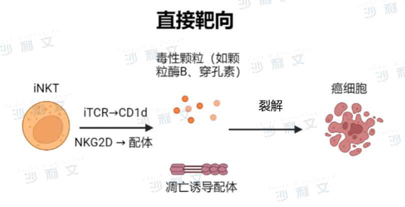 当担任效应细胞的角色时,iNKT细胞的高度特异性天然糖脂配体——α-半乳糖神经酰胺(α-GalCer)有助于激活iNKT细胞产生大量的免疫调节因子。活化的iNKT细胞能极大地增强自身直接杀伤CD1d阳性肿瘤细胞活性的能力,主要通过凋亡信号转导途径例如Fas/FasL,释放穿孔素、颗粒酶B和肿瘤坏死因子(TNF-α)相关的诱导凋亡配体等途径8,9,10。