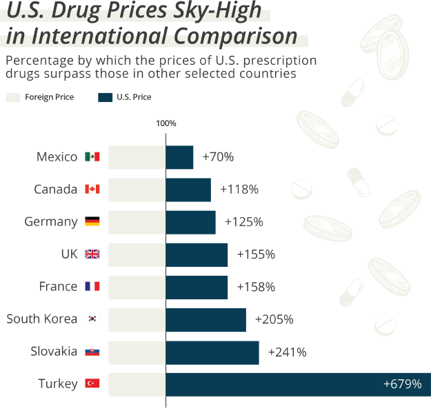 其实,在大多数情况下,美国人的药物支付费用要高于其他国家。Rand Corporation也发现,美国同种品牌药品的价格平均高出其他国家的344%。不仅如此,不同药品的平均价格也存在巨大的悬殊。墨西哥作为美国的邻国,药品平均价格降低了70%有余,而与土耳其的对比更为夸张,整整高出了土耳其679%。