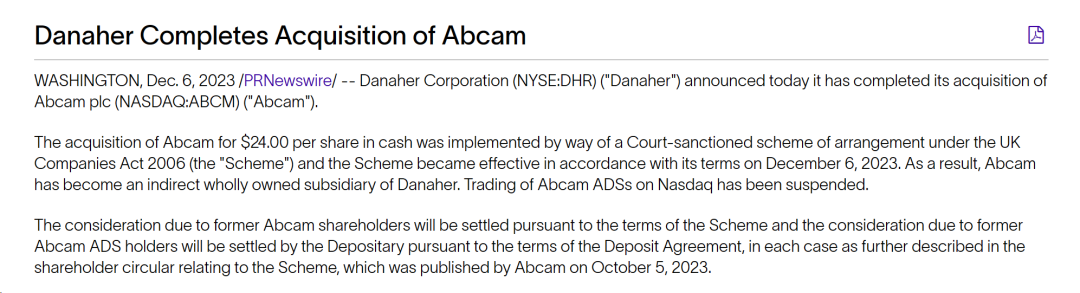 点击立即预约精彩直播!2023年12月6日,丹纳赫(danaher)终于以57亿美元拿下了Abcam。