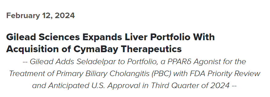2024年2月12日,吉利德宣布与CymaBay Therapeutics达成并购协议,吉利德将以每股32.5美元或总股本价值43亿美元的价格收购CymaBay。