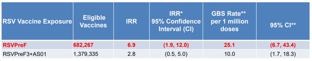 就目前观测的206万余例RSV疫苗接种者数据而言(其中辉瑞RSV疫苗约68万例,GSK RSV疫苗约138万例),每100万剂辉瑞RSV疫苗接种后出现25.1例 GBS;GSK的RSV疫苗每100万剂接种出现10.0例 GBS。