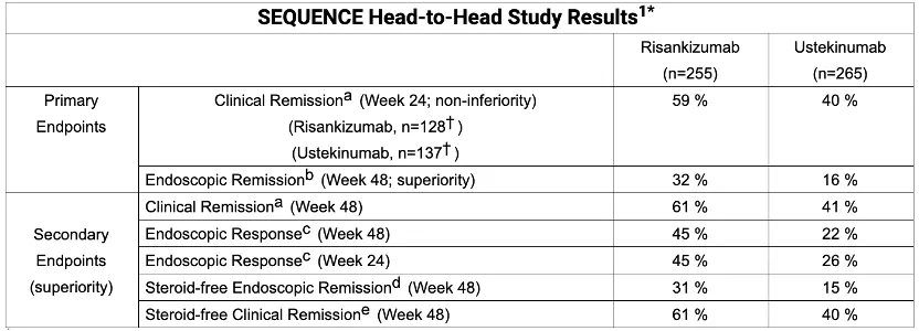 米吉珠单抗并非首个挑战乌司奴单抗的IL-23单抗。2023年9月,艾伯维同样宣布旗下Risankizumab(利生奇珠单抗)在治疗中重度克罗恩病的三期SEQUENCE研究中,头对头击败乌司奴单抗。结果显示,利生奇珠单抗在 24 周临床缓解方面不劣于乌司奴单抗(58.6% vs 39.5%);在 48 周时实现内镜缓解方面同样更优(31.8% vs 16.2%)。两组不良事件发生率相仿。在所有次要终点中(所有终点均P<0.001),利生奇珠单抗均优于乌司奴单抗。其中,48 周时,利生奇珠单抗组患者中有 31% 实现了无类固醇内镜缓解,乌司奴单抗组只有 15% 达到缓解。利生奇珠单抗组的无类固醇临床缓解率为 61%,乌司奴单抗组为 40%。2024年6月,利生奇珠单抗获FDA批准,用于中度至重度活动性溃疡性结肠炎成人患者的治疗。此前,该药物已获批包括包括斑块状银屑病、银屑病关节炎、克罗恩病三种适应症。
