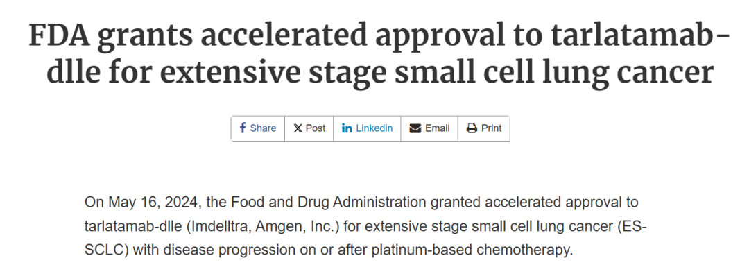 2024年5月16日,FDA加速批准安进的DLL3/CD3双抗Tarlatamab上市,用于治疗铂类化疗期间或之后疾病出现进展的广泛期小细胞肺癌(ES-SCLC),商品名Imdelltra。