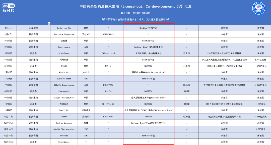 继续盘点今年出海交易,不难发现有个别药企出现的频次颇高。其中,诺纳生物与百奥赛图排名第一,出海交易数量均达到惊人的7笔,其次为百奥泰的5笔。频繁交易的背后是三家药企成熟的技术平台,是真正“下金蛋的鹅”带来的国际竞争力。