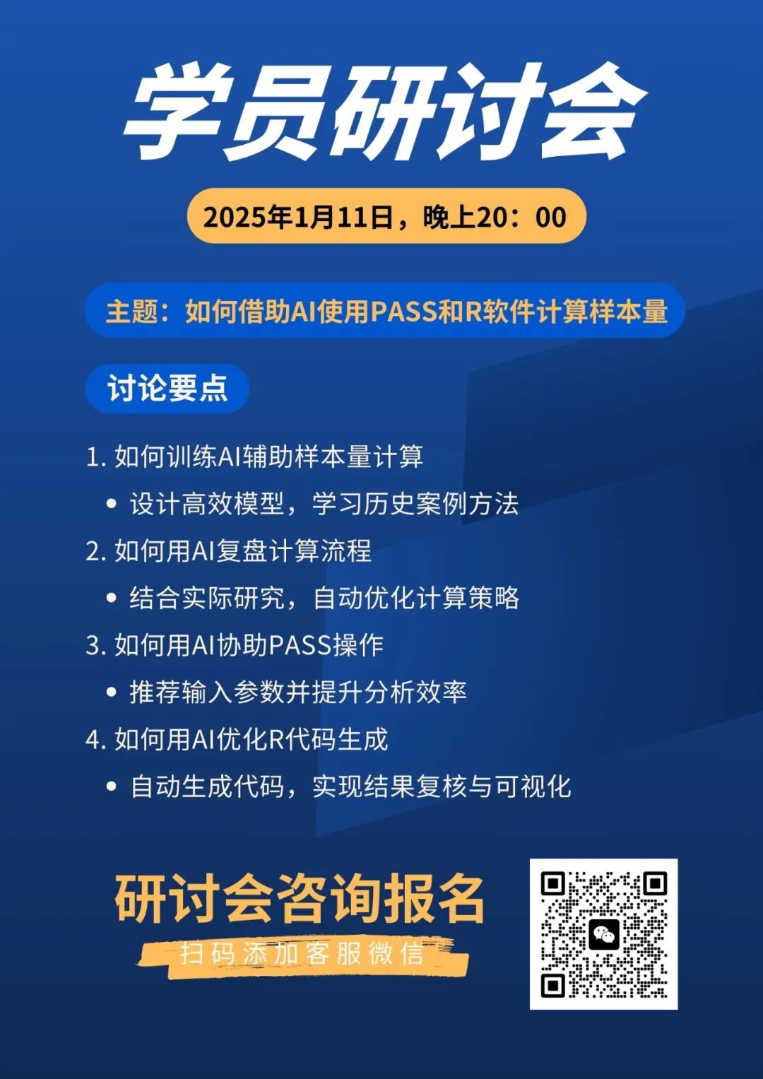 使用AI 撰写研究方案可以快速提升效率和质量,而样本量计算是大部分学员工作中会需要处理的问题。为此我们特召开学员研讨会邀请各位感兴趣的学员参会