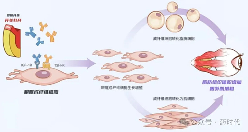 IGF-1R并非是一个“无效”靶点,只是开启的方式不对。2003年,密歇根大学研究人员Terry Smith发现甲状腺眼病(TED)患者的眼眶成纤维细胞IGF-1R表达水平升高。五年后,该团队进一步发现IGF-1R与促甲状腺素受体(TSHR)表达在相同位置,形成功能复合物。